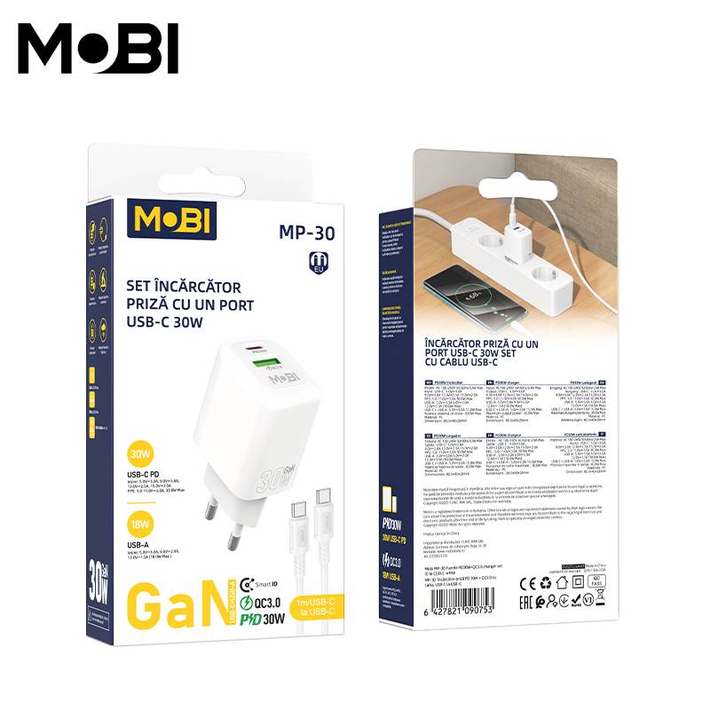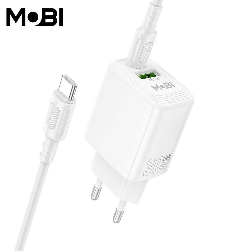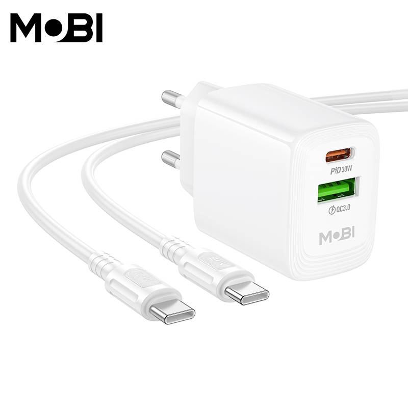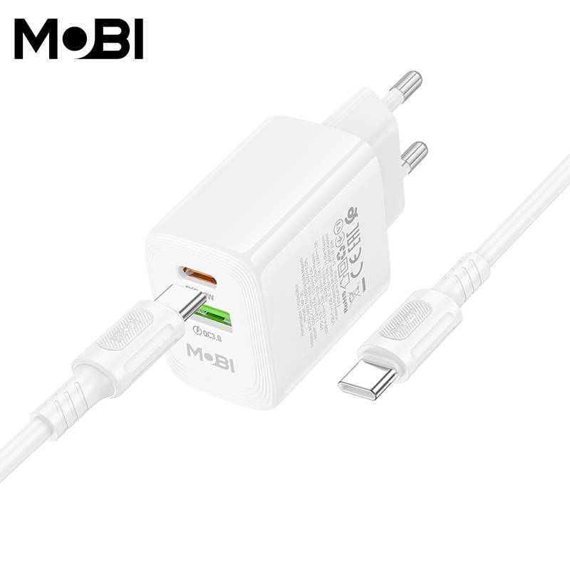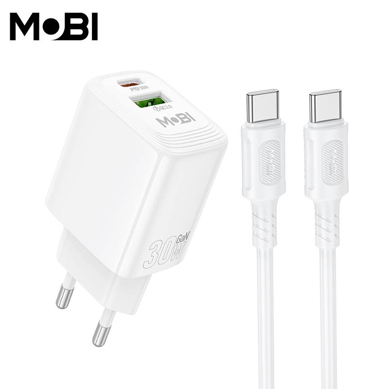 Incarcator priza Mobi MP-30 1A1C PD 30W QC 3.0 set cu cablu USB-C la USB-C alb |