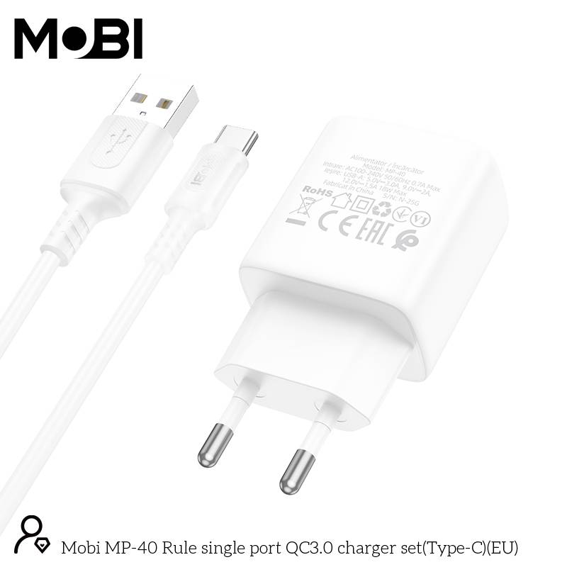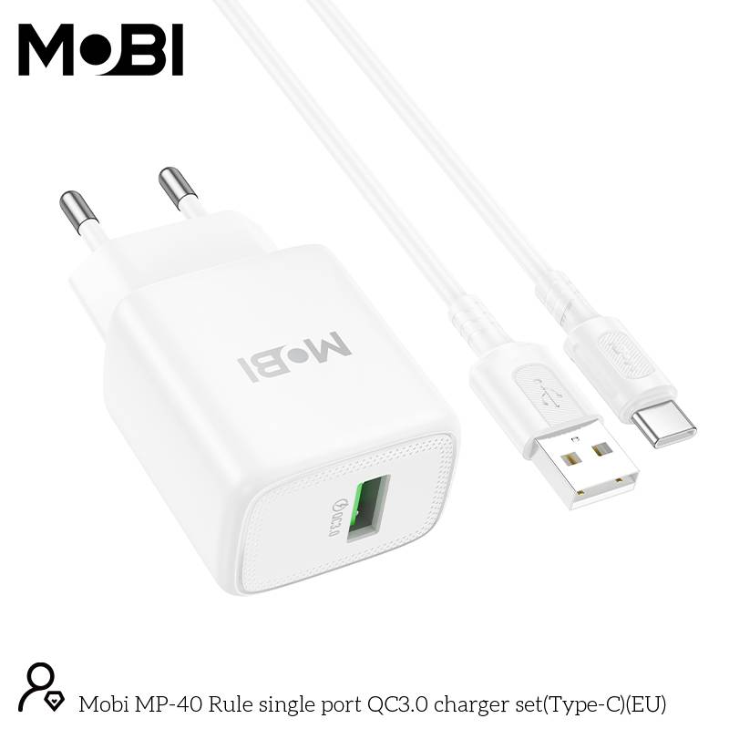 Incarcator priza Mobi MP-40 18W QC 3.0 set cu cablu USB-A la USB-C alb |