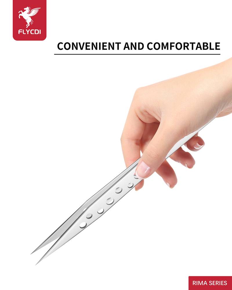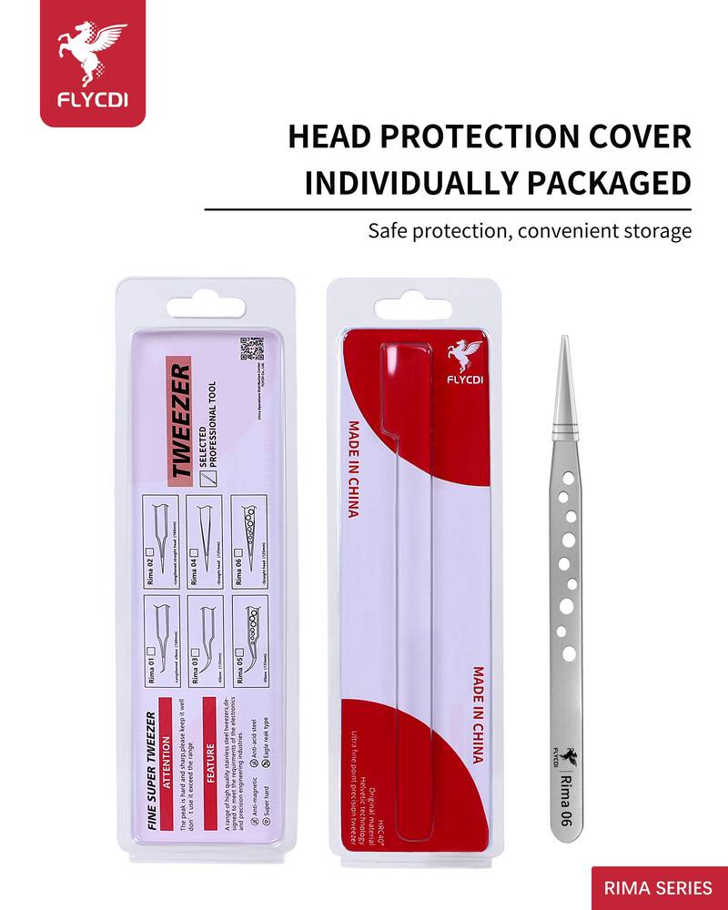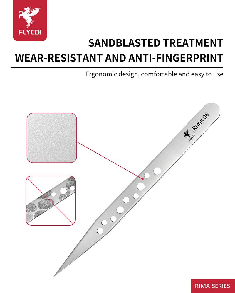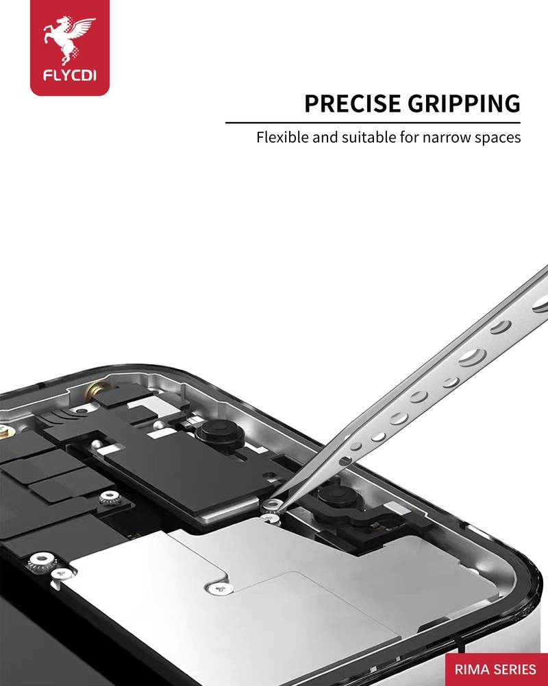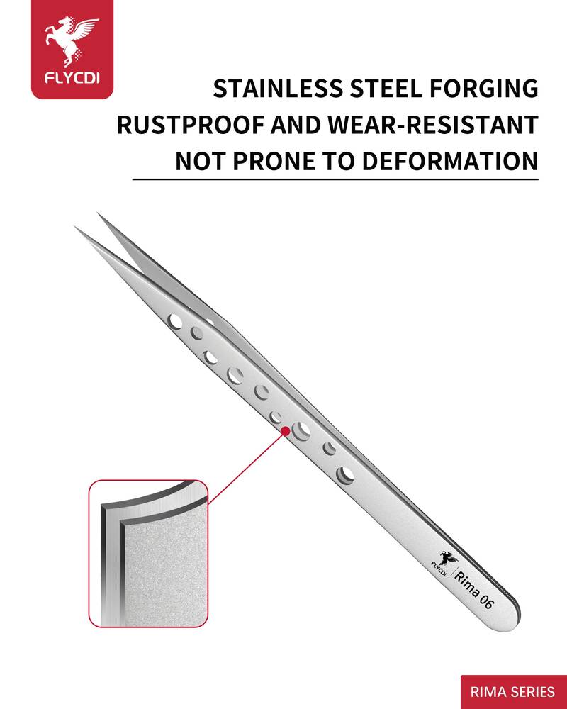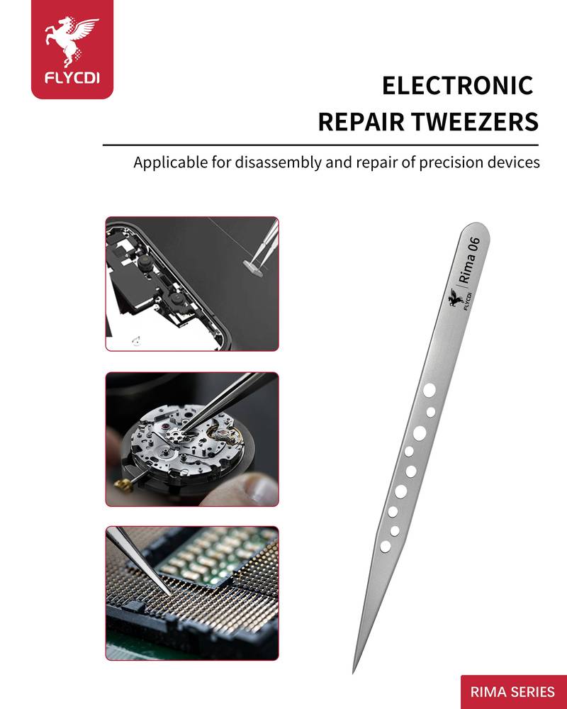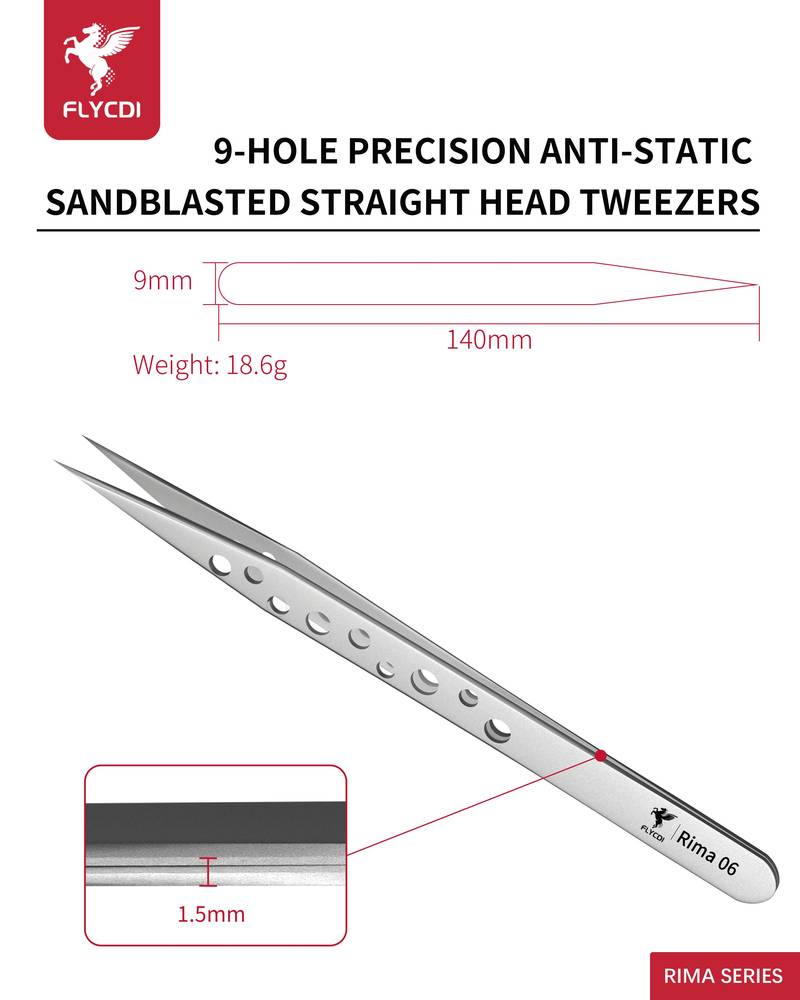 FLYCDI RIMA 06 este o pensetă profesională anti-statică cu vârf drept și design perforat cu 9 găuri, concepută pentru a oferi un control excelent, greutate redusă și precizie superioară în lucrări electronice, service GSM, reparații fine și manipularea componentelor sensibile.