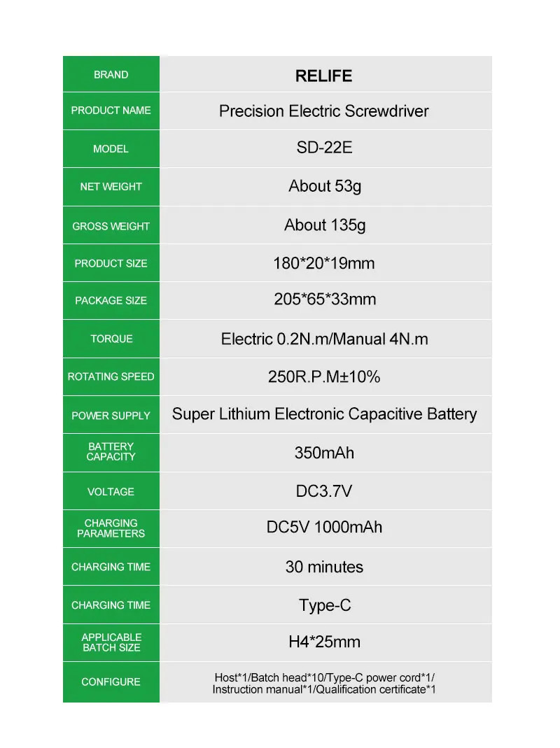 Relife SD-22E este o șurubelniță electrică de precizie, ideală pentru service-uri GSM și ateliere de electronică. Oferă cuplu dublu (electric + manual), viteză mare de rotație și alimentare prin USB Type-C, fiind perfectă pentru reparația telefoanelor mobile, tabletelor, laptopurilor, ceasurilor, ochelarilor și a altor dispozitive electronice.